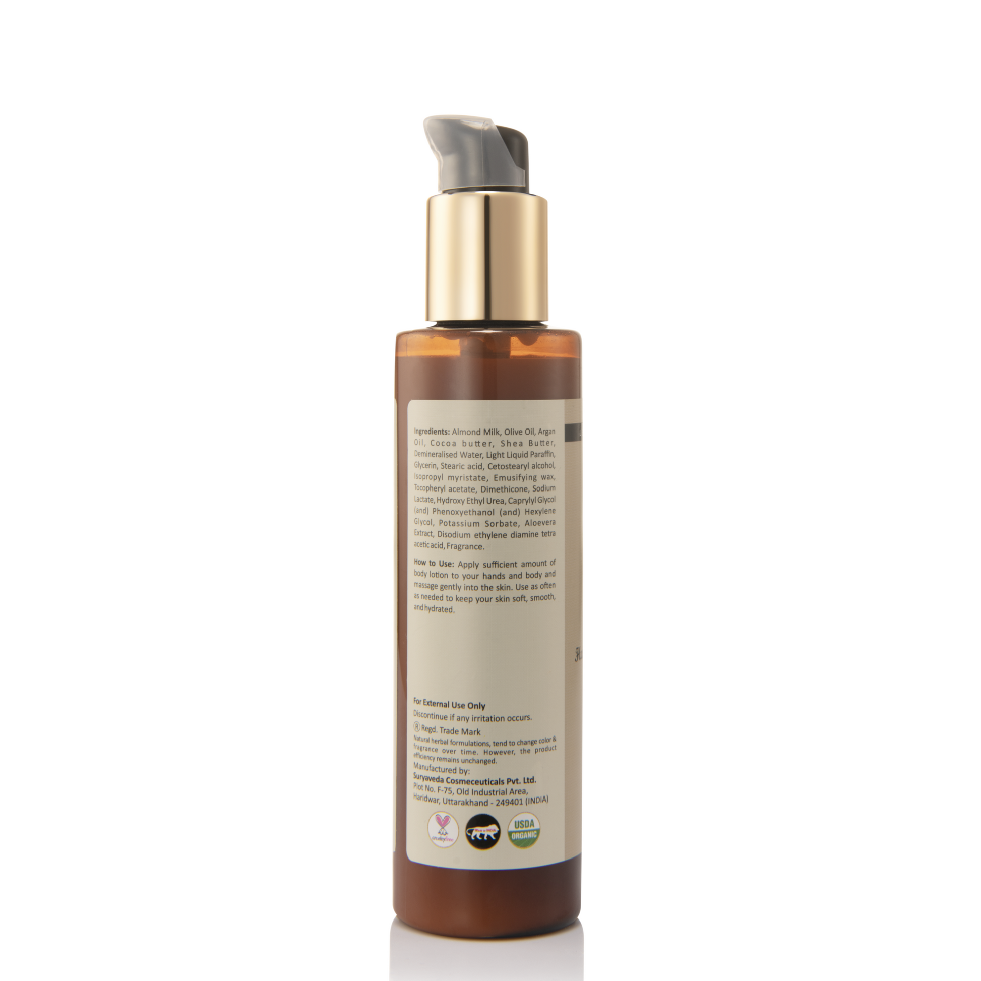 Demineralized Water, Light Liquid Paraffin, Glycerin, Stearic acid, Cetostearyl alcohol, Isopropyl myristate, Emulsifying wax, Almond Milk, Olive Oil, Argan Oil, Cocoa butter, Shea Butter, Tocopheryl acetate, Dimethicone, Sodium Lactate, Hydroxy Ethyl Urea, Caprylyl Glycol (and) Phenoxyethanol (and) Hexylene Glycol, Potassium Sorbate, Aloe vera Extract, Disodium ethylene diamine tetra acetic acid, Fragrance.