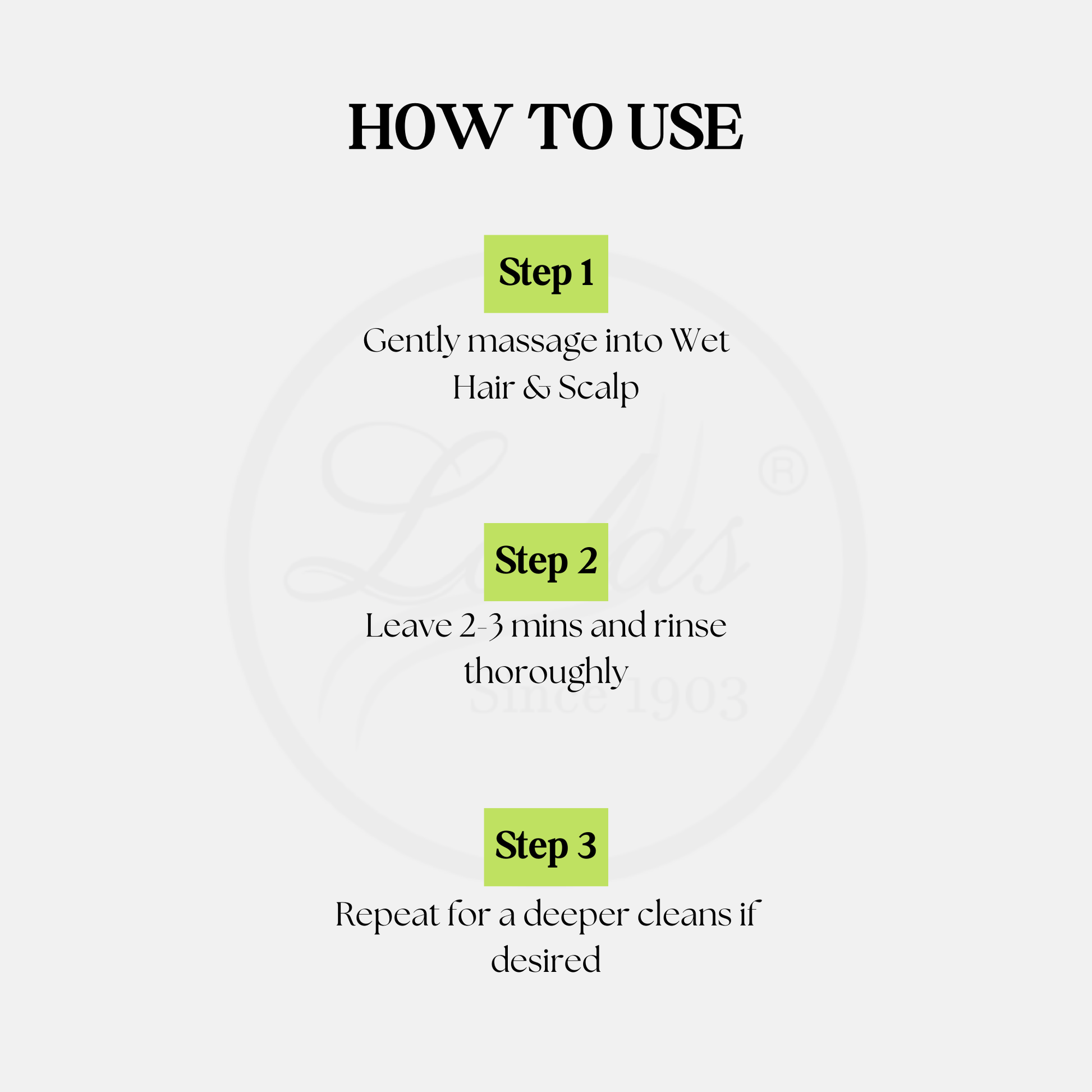 Gently massage into wet hair and scalp. Leave 2-3 minutes and rinse thoroughly. Repeat for a deeper cleanse if desired. Mild Shampoo for frequent use.