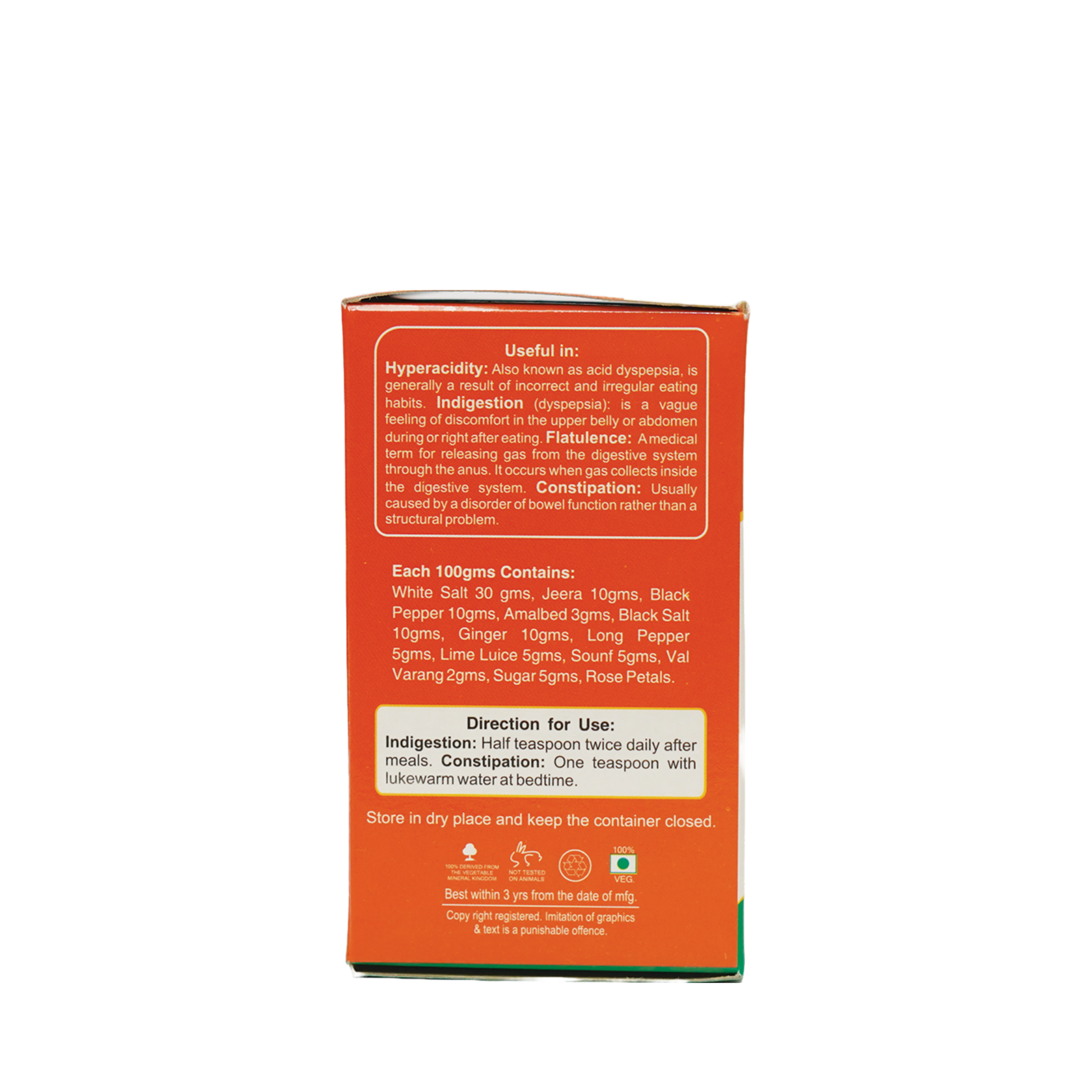 Each 100gm contains: Rock Salt 30gm, Jeera 10gm, Black Pepper 10gm, Amalbed 3gm, Black Salt 10gm, Ginger 10gm, Long Pepper 5gm, Lime Jiuce 5gm, Sounf 5gm, Vaivadang 2gm, Sugar 5gm & Rose Petal 5gm