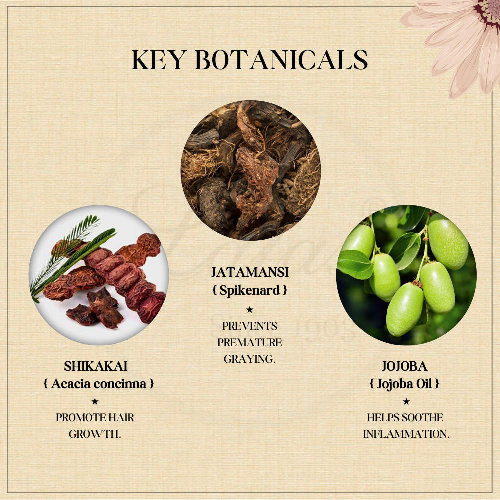 Jatamansi Root oil, Shikakai Root Oil, Almond Oil, Olive Oil, Jojoba Oil, Coconut Oil, Castor Oil, Glycerin, Aqua, Aloe Vera Leaf Extract, Vetiver Oil, Sodium Cocoate (Saponified Coconut Oil), Sodium Palmate (Saponified Palm Oil), Organic Bees Wax, Fragrance & Color.