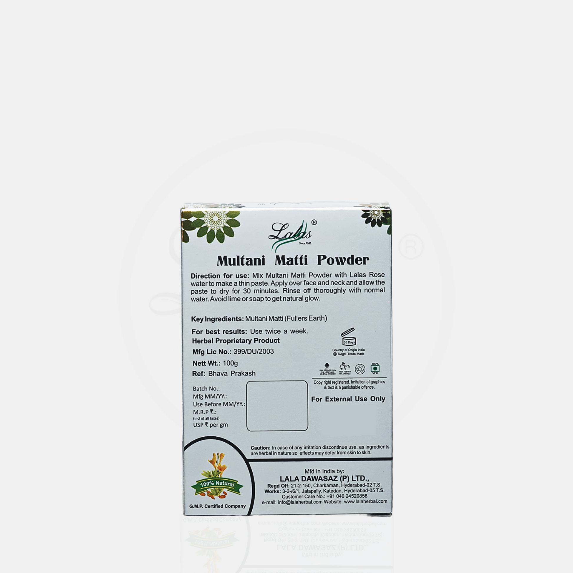 Lalas Multani Matti Powder is a natural skincare essential that nourishes and softens the skin while imparting a radiant glow. Rich in magnesium chloride, it effectively absorbs excess oil and instantly cools irritated skin. Ideal for acne-prone skin, it soothes and reduces blemishes, scars, pimples, suntan, and pigmentation. Regular use helps eliminate blackheads and whiteheads, promoting a clearer, softer, and more supple complexion. This natural cleanser enhances skin clarity and balance, making it a trusted choice for expert skincare routines.