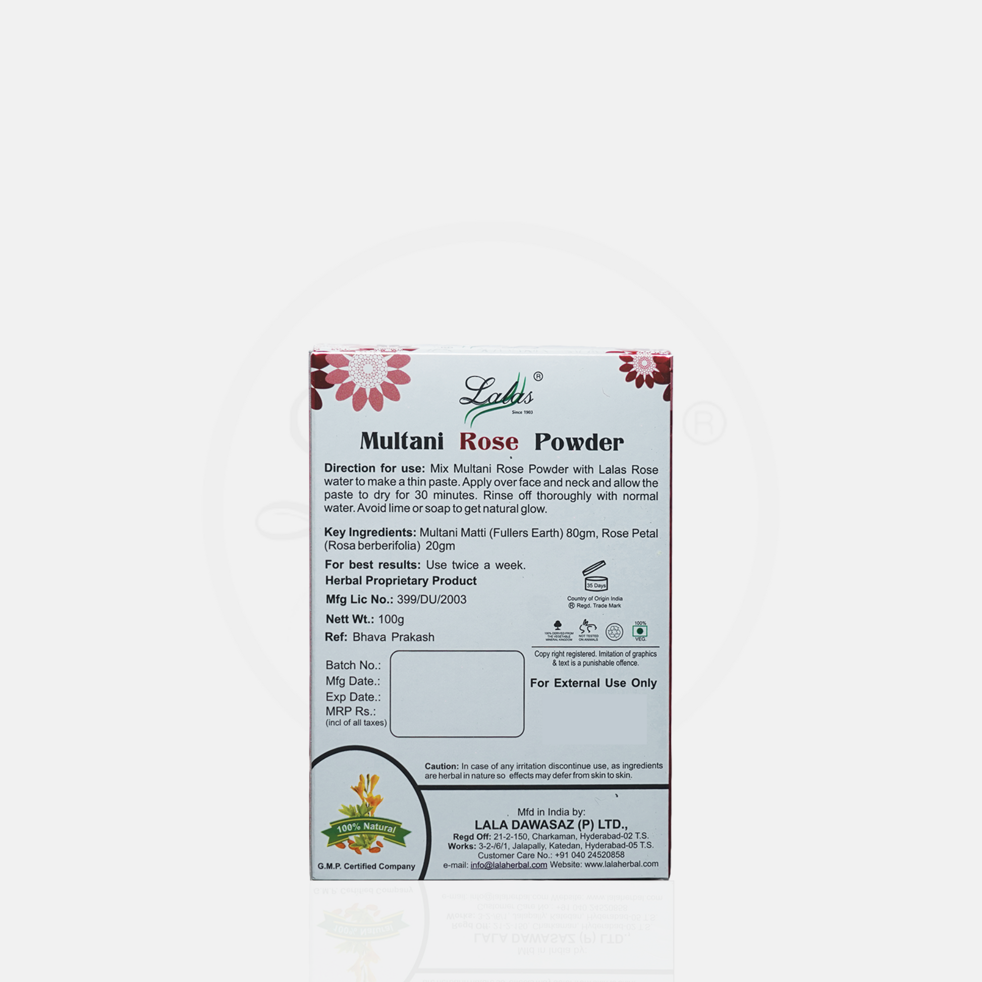 Mix Multani Rose Powder with Lalas Rose water to make a thin paste. Apply over face and neck and allow the paste to dry for 30 minutes. Rinse off thoroughly with normal water. Avoid lime or soap to get natural glow.
