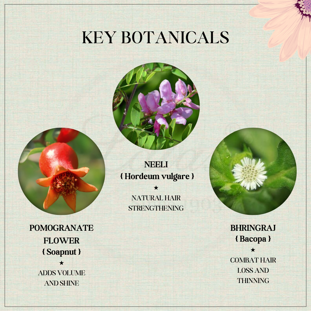 Neeli (Indigo) Bhringraj, Shikakai, Kalonji, Methi, Henna Leaves & Pomogranate Flower Extarct Purified Aqua, Decyl Glucoside, Coco Glucoside, Sodium Cocoamphoacetate, Sodium Lauryl Sarcosinate, Propendiol, Guar Gum, Sodium Gluconate, Potassium Sorbate, Caprylil Glycol (and) phenoxyethanol (and) Haxylene Glycol, Essential Oil & Fragrance.