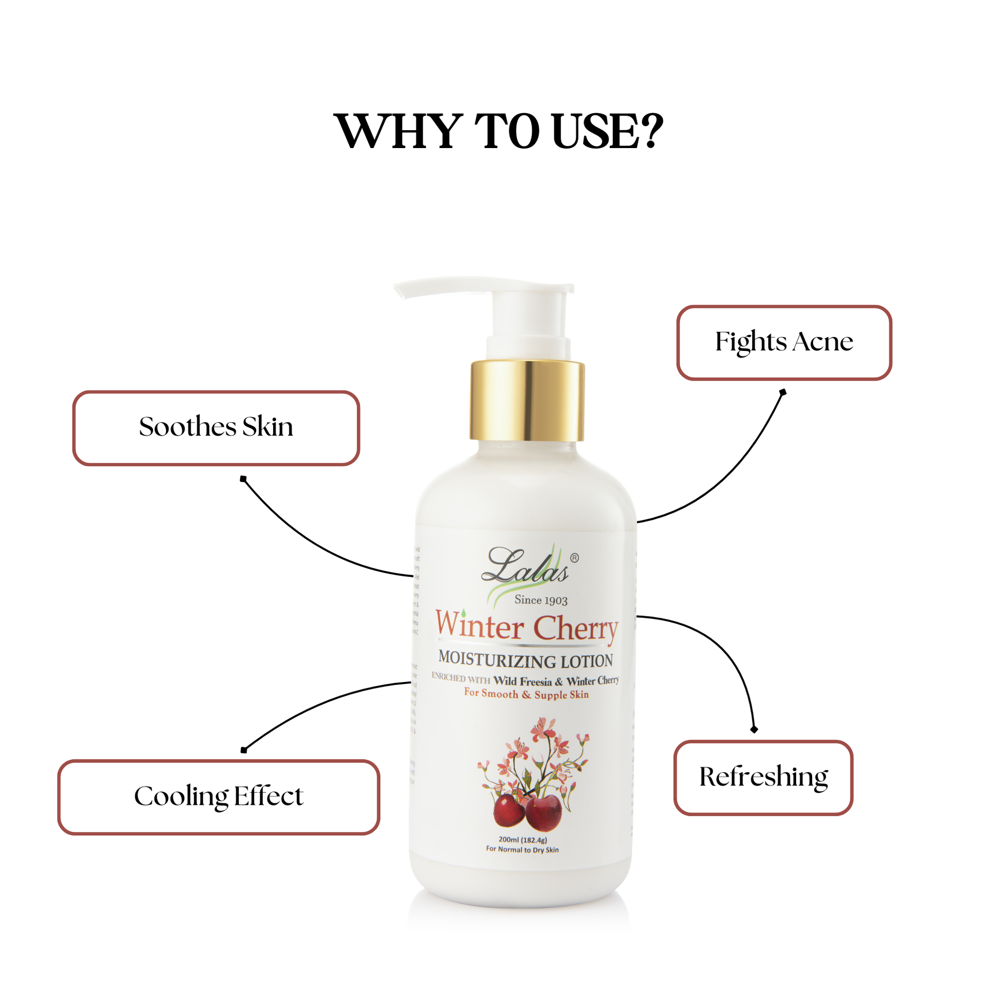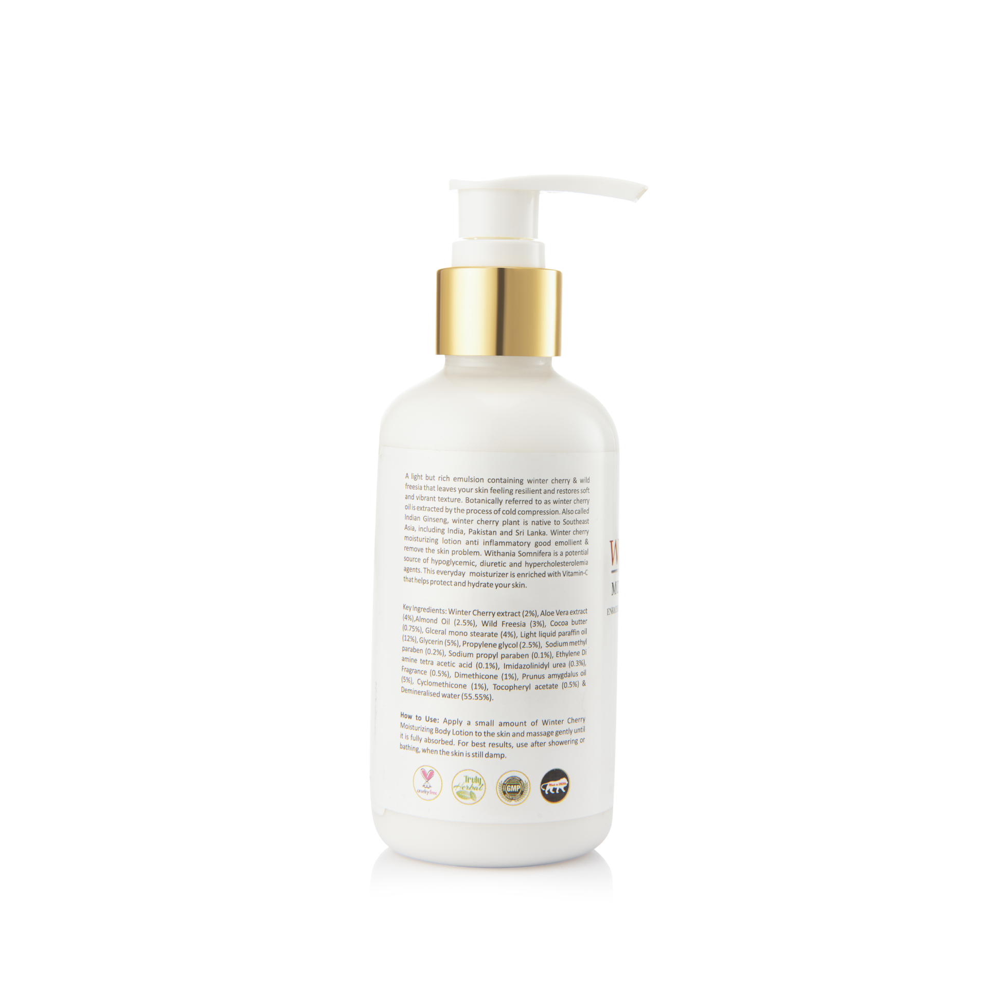Winter Cherry extract (2%), Aloe Vera extract (4%),Almond Oil (2.5%), Wild Freesia (3%), Cocoa butter (0.75%), Glceral mono stearate (4%), Light liquid paraffin oil (12%), Glycerin (5%), Propylene glycol (2.5%), Sodium methyl paraben (0.2%), Sodium propyl paraben (0.1%), Ethylene Di amine tetra acetic acid (0.1%), Imidazolinidyl urea (0.3%), Fragrance (0.5%), Dimethicone (1%), Prunus amygdalus oil (5%), Cyclomethicone (1%), Tocopheryl acetate (0.5%) & Demineralised water (55.55%).