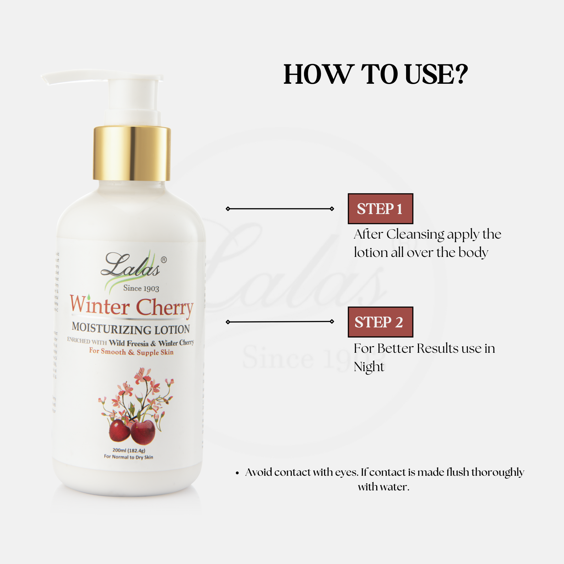 Winter Cherry extract (2%), Aloe Vera extract (4%),Almond Oil (2.5%), Wild Freesia (3%), Cocoa butter (0.75%), Glceral mono stearate (4%), Light liquid paraffin oil (12%), Glycerin (5%), Propylene glycol (2.5%), Sodium methyl paraben (0.2%), Sodium propyl paraben (0.1%), Ethylene Di amine tetra acetic acid (0.1%), Imidazolinidyl urea (0.3%), Fragrance (0.5%), Dimethicone (1%), Prunus amygdalus oil (5%), Cyclomethicone (1%), Tocopheryl acetate (0.5%) & Demineralised water (55.55%).
